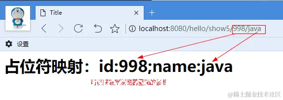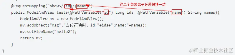 @PathVariable("xxx")通过 @PathVariable 可以将URL中占位符参数{xxx}绑定到处理器类的方法形参中@PathVariable(“xxx“)@RequestMapping(value=”user/{id}/{name}”)请求路径:http://localhost:8080/hello/show5/1/james
