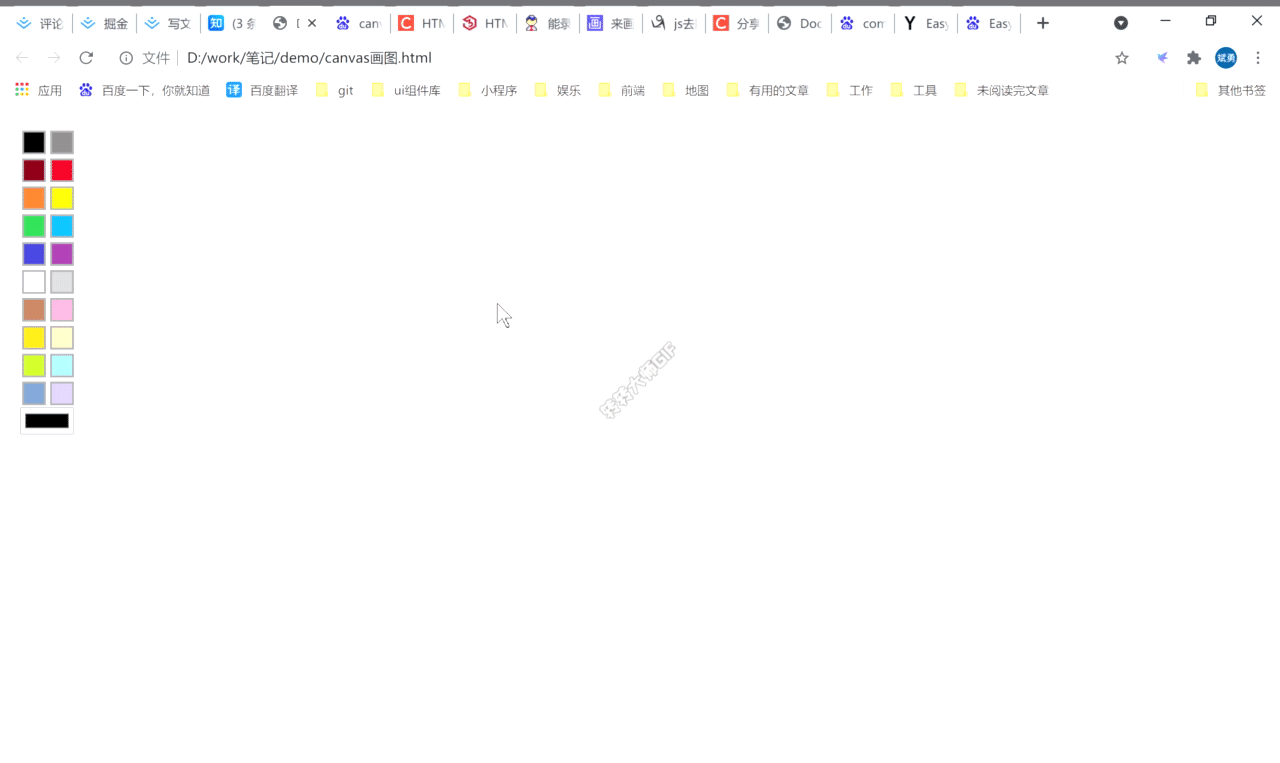 这里有一个编写过程中遇到的问题,当选中不同颜色后再绘制一条新曲线的话会将之前绘制的曲线颜色全部改变,这是因为canvas每次都是在重画,当你画第二笔的时候,其实第一笔也是在重新渲染,这就导致之前的曲线颜色也变掉,解决方法就是每次画新线段的路径前,都要用ctx.beginPath(),清除之前的路径