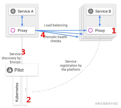 (1)用户在控制平面的后台,通过Pilot的API,修改A到B的路由策略(标号1);