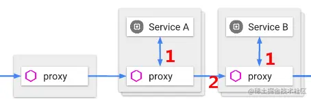 - 一个容器Pod内的一个服务,服务进程(SrvA/SrvB)和边车进程(Proxy) 是相生相伴的,他们之间的交互是本地交互(标号1)