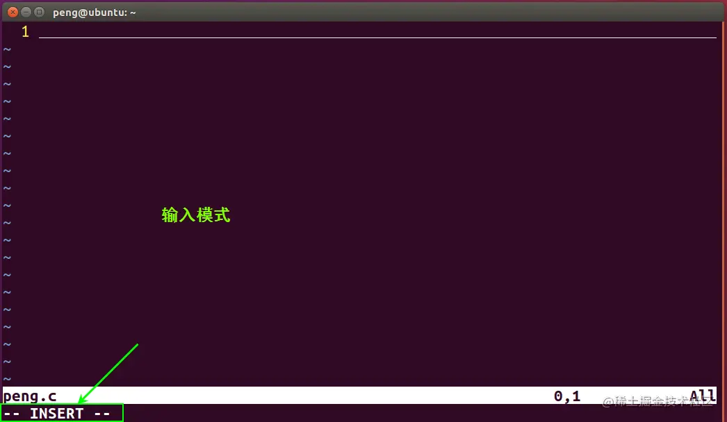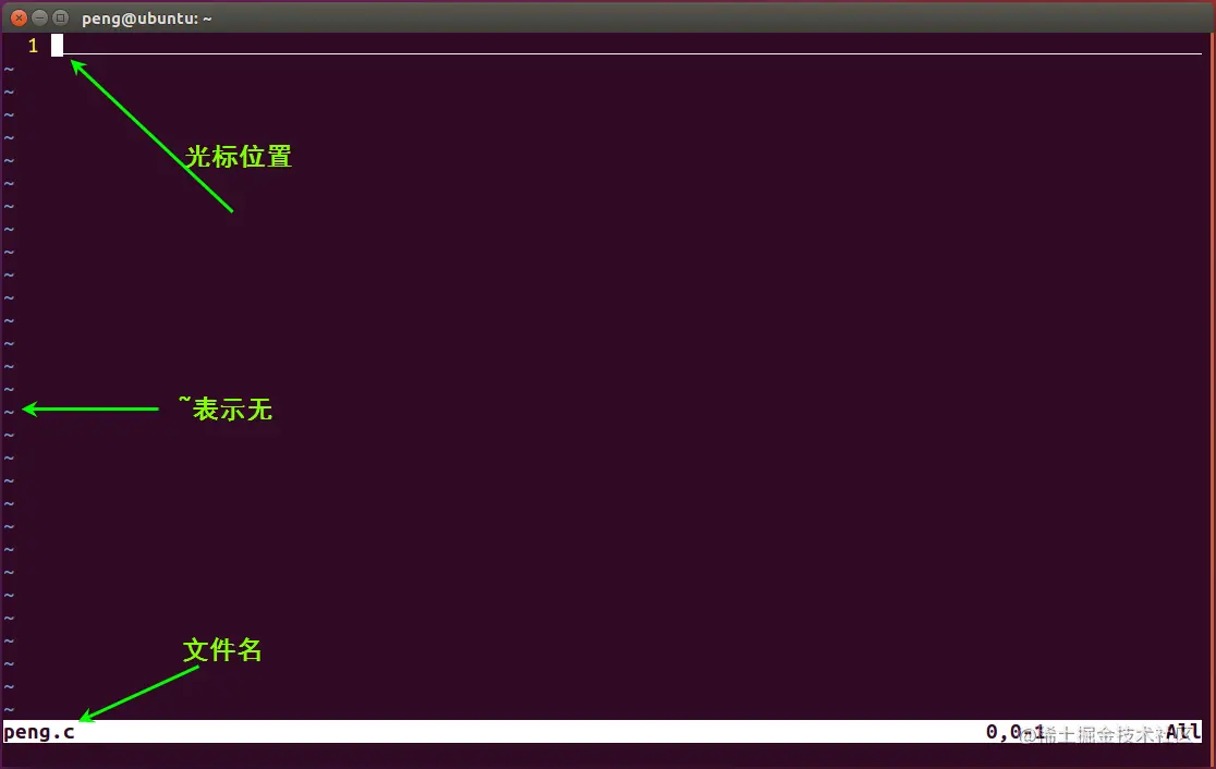 如果你想要使用 vim 来建立一个名为 peng.c 的文件时,输入下面命令: