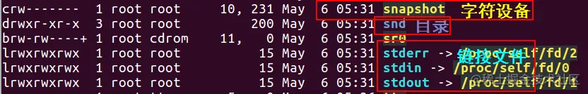 | 字符设备 | c | 字符设备文件:即串行端口的接口设备,例如键盘、鼠标等等。第一个属性为 [c] |