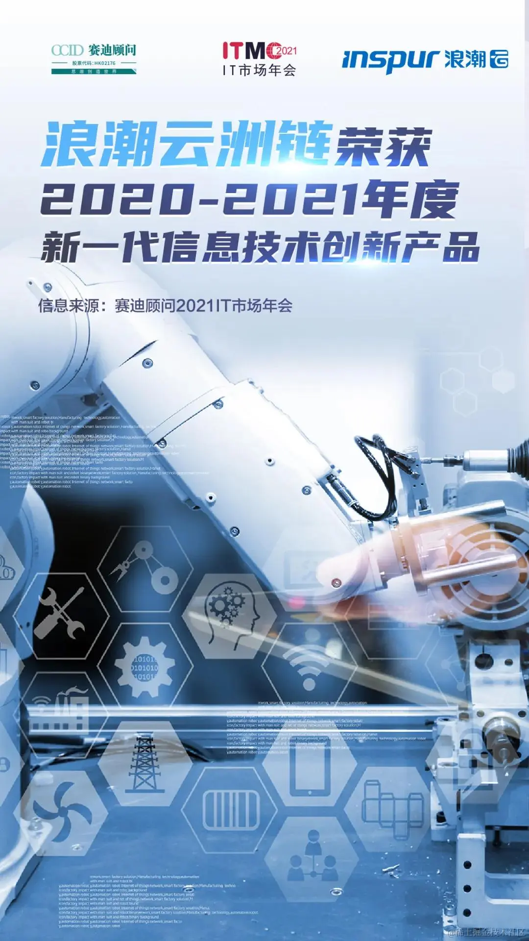 5月20日,赛迪顾问主办的2021 IT市场年会在北京举行。作为工业互联网领域代表,浪潮云洲链斩获2020-2021年度新一代信息技术创新产品殊荣。