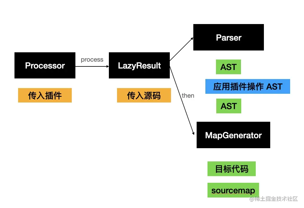 Processor:传入插件,返回 LazyResult,有 use(传入插件)、process(返回结果) 方法LazyResult:传入源码,调用 Parser 对源码进行 parse,有 then(异步获取结果)方法,会用插件对 AST 转换,然后调用 MapGenerator 打印 ASTParser:传入源码,返回 ASTMapGenerator: 传入 AST,打印成目标代码,并生成 sourcemap。