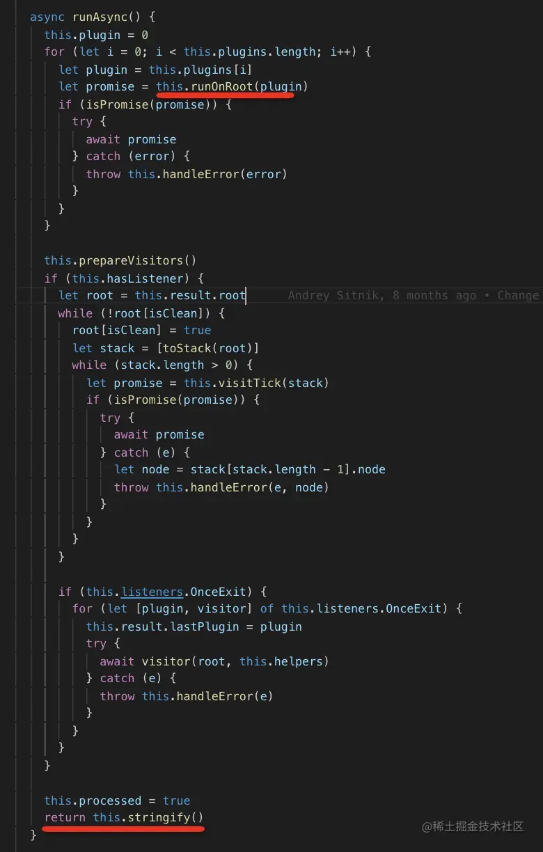 then 里面会调用 aync,会应用插件,处理 AST(root),最终返回 stringifier 的结果。