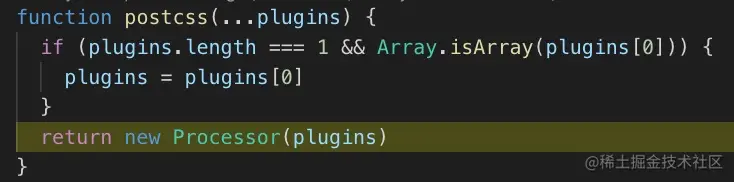 首先调用的 postcss 方法返回 Processor 对象,而 Processor 对象有 use(应用插件)、process(处理 css) 等方法,所以才是 postcss([]).process