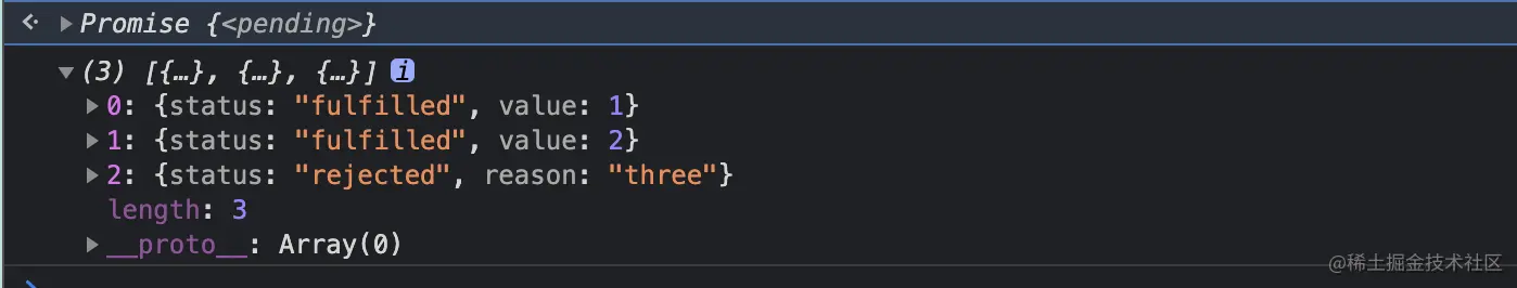 与 Promise.all 不同的是,当 promise 被 reject 之后,我们不会直接 reject ,而是记录下该 reject 的值和对应的状态 'rejected' ;