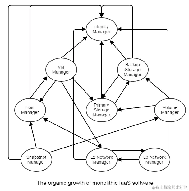 构建一个IaaS软件是很难的,这是一个已经从市场上现存的IaaS软件获得的教训。作为一个集成软件,IaaS软件通常需要去管理复杂的各种各样的子系统(如:虚拟机管理器hypervisor,存储,网络,身份验证等)并且需要组织协调多个子系统间的交互。例如,创建虚拟机操作将涉及到虚拟机管理模块,存储模块,网络模块的合作。由于大多数IaaS软件通常对架构考虑不够全面就急于开始解决一个具体问题,它们的实现通常会演变成: