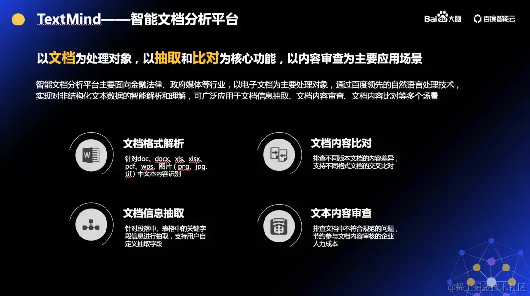 在对“物”的服务领域,企业中合同管理、项目管理、采购管理等系统中,存在着大量的非结构化的文档需要人工处理。针对这种复杂文档,百度大脑推出了 TextMind 智能文档分析平台,主要拥有四大功能: 1️⃣ 文档格式解析,能够识别 doc、pdf、图片等多种格式中的文本内容; 2️⃣ 文档内容比对,可以比对不同版本文档的内容差异; 3️⃣ 文档信息抽取,针对段落中、表格中的关键字段信息进行抽取,并支持用户自定义抽取字段; 4️⃣ 文本内容审查,审查文档中不符合规范的问题,智能地快速发现问题。 通过 TextMind 智能文档分析平台,可以实现对非结构化文档数据的智能解析和理解。针对不同场景下的复杂文档、表格文档,百度通过创新性的 OpenKV、TableKV、DocKV 等文档抽取技术,并基于百度积累的预训练模型,加入少量标注数据训练后,就可以达到90%以上的高精度效果。