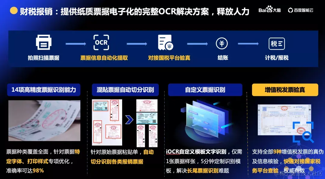 在对“财”的服务领域,百度大脑提供了纸质票据电子化的完整 OCR 解决方案,该方案全面覆盖各种票据,针对票据特定字体、打印样式专项优化,票据拍照扫描识别准确率可达98%,从而实现自动化提取票据信息,自动切分识别各类报销票据;支持全部9种增值税发票的真伪及信息核验,从而提升财税管理效率。 针对版式不固定的票据,百度大脑还推出了 EasyDL OCR 自训练平台,可支持业务人员对票据进行标注以及训练,从而得到定制的高精度 OCR 模型,满足多种场景中票据识别需求。该平台具备零门槛操作、低成本数据、高精度效果、超灵活部署的优势。