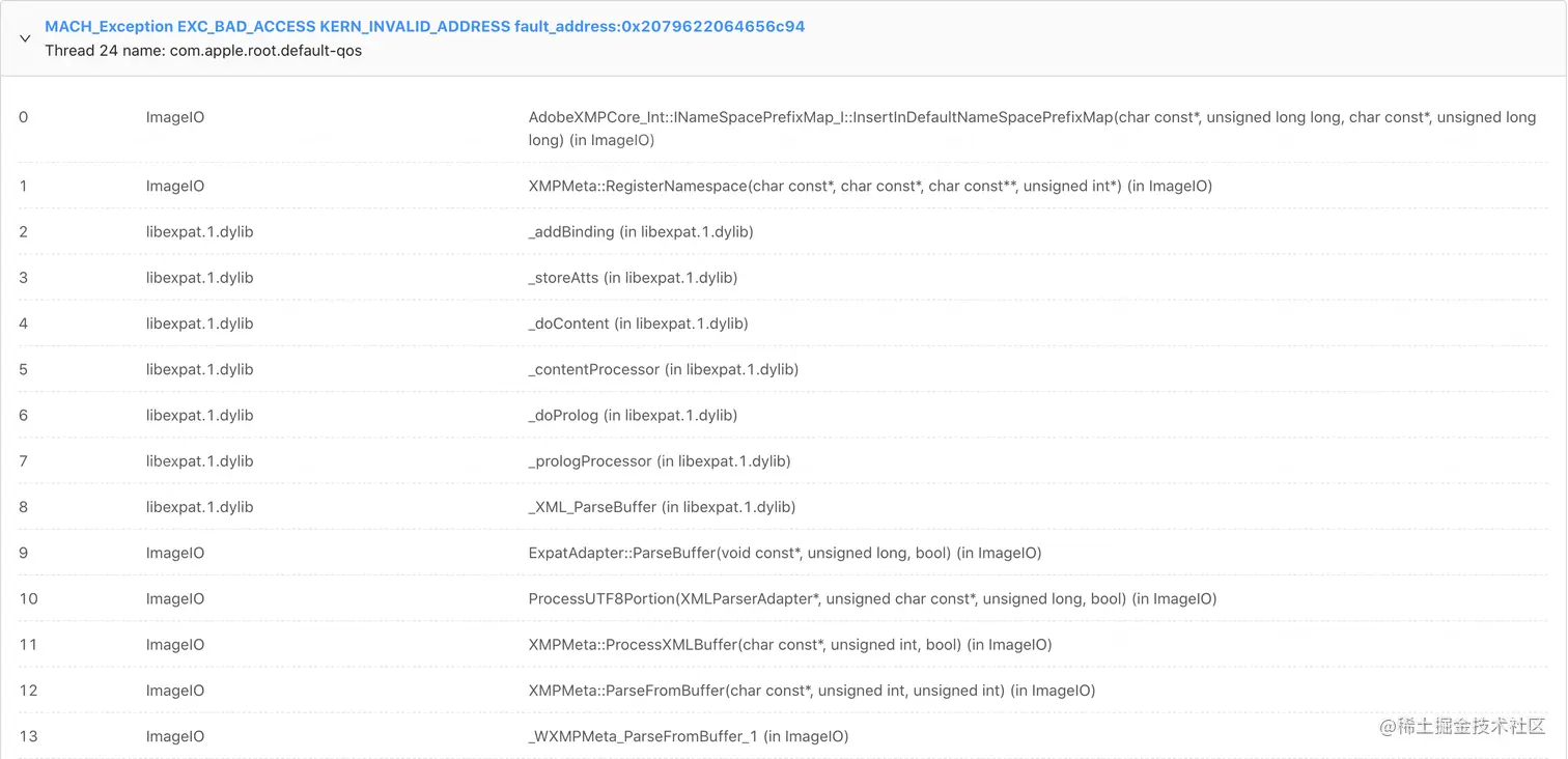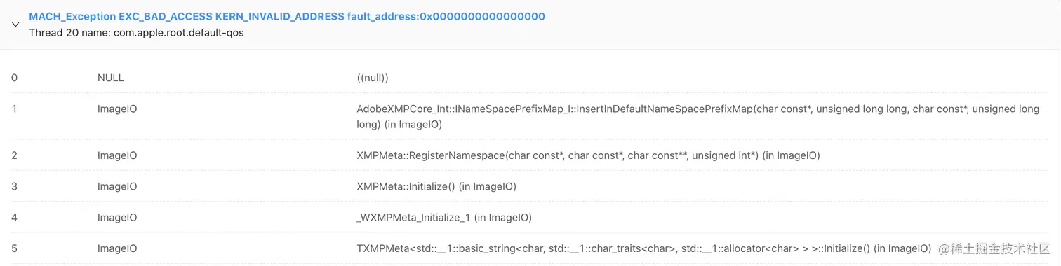 CFDictionaryRef CGImageSourceCopyPropertiesAtIndex(CGImageSourceRef isrc, size_t index, CFDictionaryRef options);这个方法在解析部分图片的时候最终会访问全局变量ImageIO`AdobeXMPCore_Int::ManageDefaultNameSpacePrefixMap(bool)::sDefaultNameSpacePrefixMap -