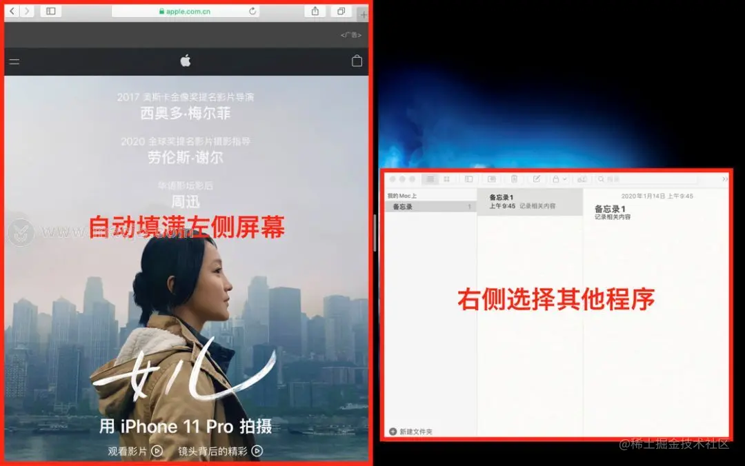 首先我们看到的是正常打开的两个软件,Safari 浏览器和 Notes 记事板。