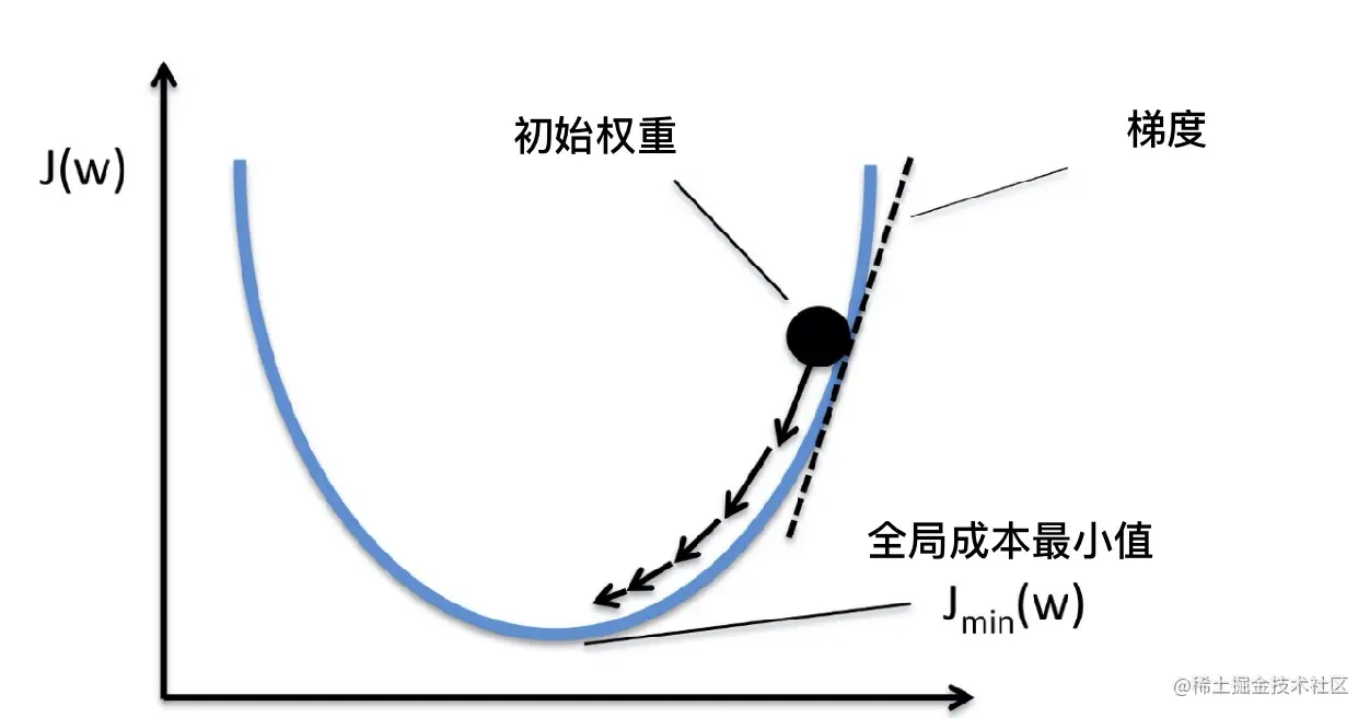 梯度下降可以使我们能够找到一个函数的最小值。在我们的例子中,我们寻找的是成本函数的最小值。 它的工作原理是在每次数据集迭代后以小增量更改权重。通过计算成本函数在某一权重下的导数(或梯度),我们可以看到最小值在哪个方向。