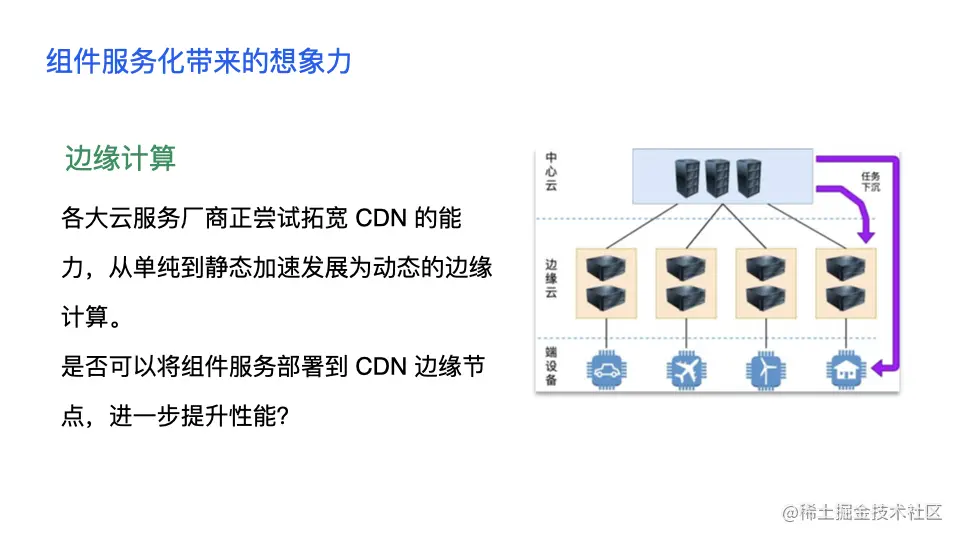 目前我们可以看到在很多云服务的厂商里面都有提到一个概念,就是边缘计算的概念,一种是基于边缘的物理服务器,边缘容器等等,另外一种是基于 CDN 的能力,直接在 CDN 上去做边缘计算,简单来说就是我们传统的 CDN 只是拿来加速你的静态资源访问的,比如说 JS、CSS 借助 CDN 你可以更快的去获取,因为 CDN 离用户会更近, CDN 的节点,以后可能会有这种动态的能力,在 CDN 节点上也可以做一些运算,我们可以在上面去做服务的渲染,然后可以做到更快的给用户一个服务端渲染的结果。