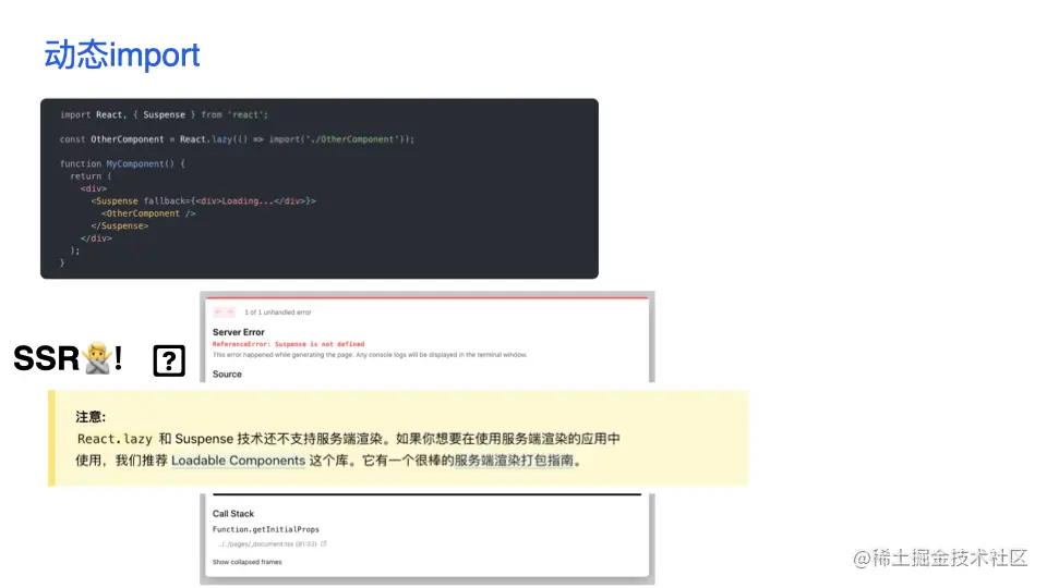 如果我们把这套方案直接放到服务器上去执行的话,就会抛出异常。React 官方文章里面也有声明,这种方式不支持服务端渲染。所以如果我们需要使用服务端渲染,React 也给了一个社区方案,我们也去尝试了社区的这个叫 Loadable components 的库,然而这种方式并没有达到我们的要求。主要原因是它的服务端渲染并不是彻底的,它最终只是渲染了 loading 的部分。