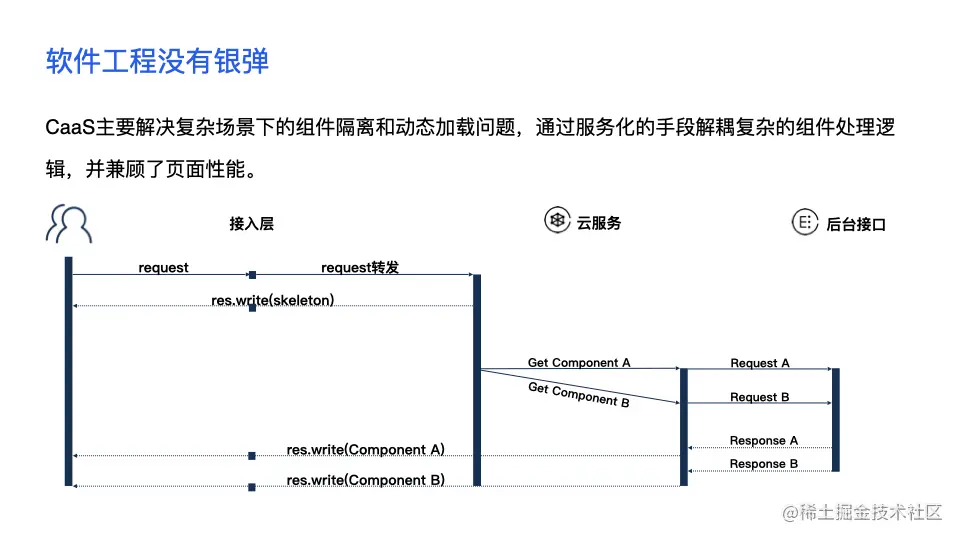 我们知道有一句很有名的话叫软件工程没有银弹,就是说在软件工程领域其实没有什么方案可以包治百病,CaaS 其实也是一样,它专注解决的一些特定的场景:就是在复杂的组件场景下,要实现组件的隔离和动态加载,并且在解决这些问题的情况下能够兼顾页面的性能,使得整个将来的性能仍然保持在一个比较优秀的状态中。所以我们最终得出的是这样的一个方案,将组件放在服务中,而组件放在服务中之后还会带来一个新的想象空间。