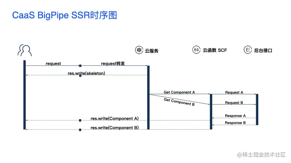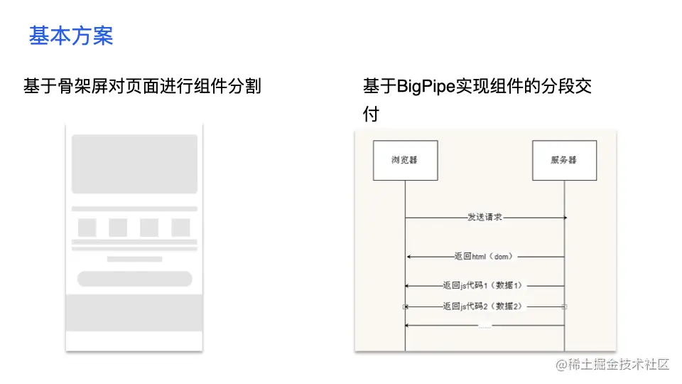 我们基于 BigPipe 的做法是当我们的用户从浏览器发起请求到服务器的时候,我们首先直接将静态的骨架屏的 HTML 直接返回,那么用户就可以在最短的时间内看到一个基本的结果,然后再通过服务器向组件的服务发起请求。在组件服务渲染结束之后再分段,哪个组件渲染完,哪个组件就可以先返回,然后逐步的渲染到用户的一个页面上,这就是一个基本的方案。