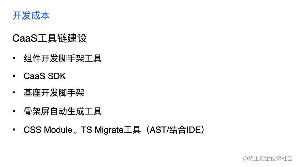 前面讲的就是这个方案会有一定的开发成本,我们需要对组件本身做一些改造,让它可以部署到一个服务上面去,然后另外一个对主页面也要做一个基本的改造,让这个页面可以去加载它所需要的组件。我们针对这种情况,开发了一个工具链,分别去解决这些问题。对于组件来说,其实大部分不管是 CI/CD 的这种部署也好,或者是它的这种开发的 Webpack 配置等等,这些都是固定的,通过一个脚手架的方式都可以快速的解决这些问题。