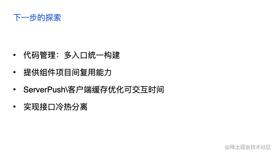 另外一点就是当下也可以做的一些,包括在代码管理上、组件复用上,其实组件复用这一块也有非常多,像前面的一些老师也有讲到,在组件复用上也可以进一步的去优化。还有就是关于 Server Push,在 HTTP2 里面有一个能力可能会被大家不怎么注意:Server Push 能力,服务端可以直接提前去推动一些文件到客户端,比如说我们组件的 JS, CSS 完全可以提前推送给用户,然后都在客户端做一个缓存,这样可以进一步的去减少我们的可交付时间。页面除了渲染出来的一个结果,用户在上面操作的时候,他必须要 JS 加载完成,才能够响应用户的操作。所以如果能够更早的把 JS 推送到客户用户的手里面,用户可以更快的去交互,这也是一个可以优化的点。另外前面提到的这种接口层的分离,针对于接口本身的一个优化。