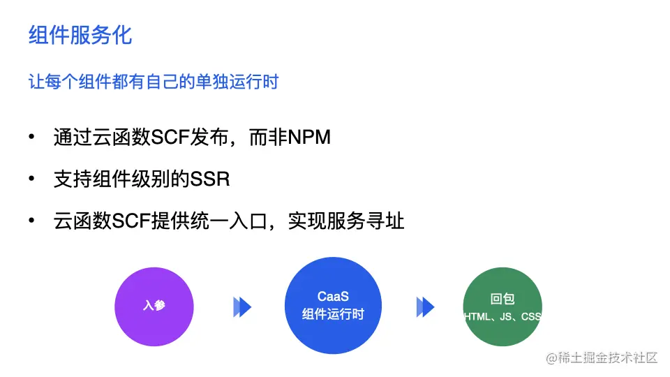 为了解决这样的一个问题,我们团队就有一个思考,能否让整个组件去实现服务化。特别是今天我们知道像云函数、Serverless 等概念也非常的热门,结合 Serverless 的能力,我们把我们的组件直接搬上了 Serverless 运行,组件其实可以理解成是一个微型的服务端渲染的页面,然后我们的主页面在向这些云函数请求组件渲染的结果,将这些渲染结果展示出来,这样的话就可以做到更细粒度的组件级别的服务端渲染,并且每个组件都可以相对的隔离。