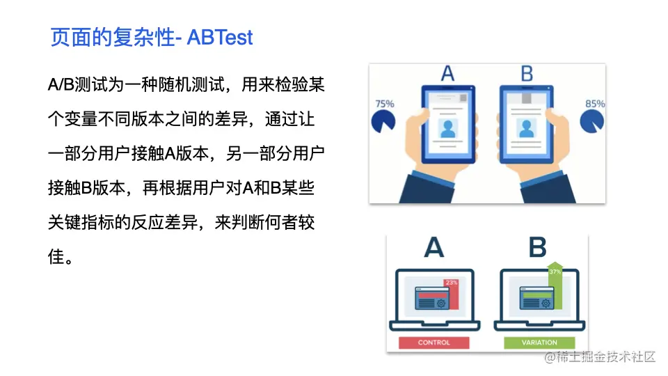 页面的复杂性在今天为什么会变得越来越高了。有个非常典型的例子就是 ABTest,在我们的业务中,这两年 ABTest 运用得非常的广泛。所谓 ABTest,对于页面中 UI、交互,或者是产品逻辑,通过做对比实验的方式,开发不同的组件,然后再投放到真实的用户中,最后分析每个用户最终的数据上报,来确定说方案是不是更优的。在做 ABTest 的时候就会引入一个问题,我们的页面里面它所包含的组件会越来越多,比如说一个页面我们分了几个模块,每个模块都可以做实验,而每个模块都有两个实验,一个是对照组,一个是实验组。那么通过排列组合的话,可能就会有几十种页面呈现的结果,这正是导致页面复杂性指数级增加的一个点。