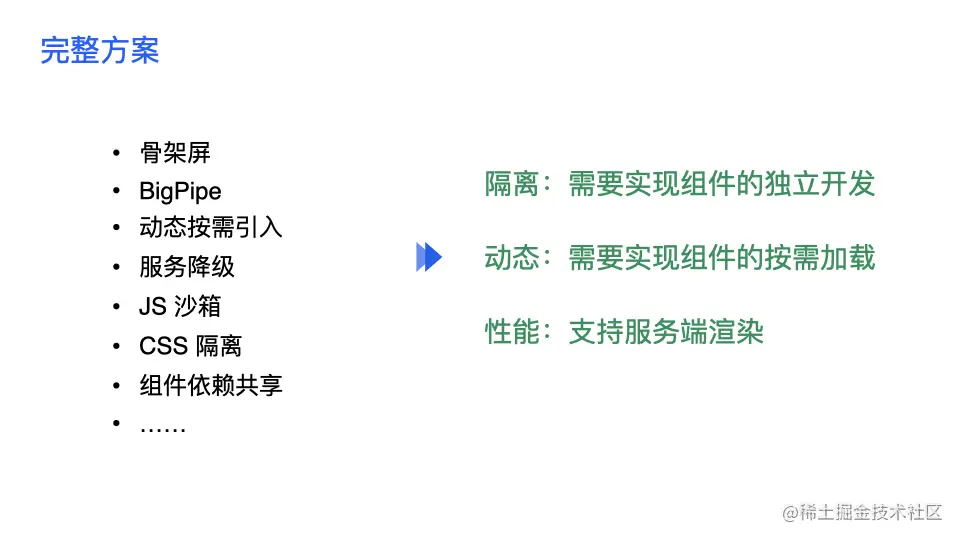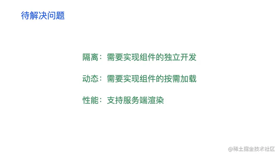 第三点就是前面提到的性能优化,我们希望我们的组件本身就可以支持服务端渲染,再结合其他的性能优化手段,可以让我们的整个首屏渲染的性能得到更大的提升。