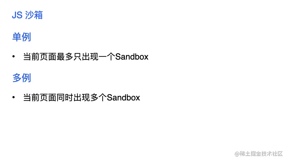 沙箱其实有两大类,第一类就是所谓的单例模式,你页面中其实会只有一个沙箱,所有东西都是在沙箱里面去完成的。而第二种就是多例的模式,就是你每个组件会有一个自己的沙箱,通过多沙箱的方式来实现。这两个方式分别怎么做的,有多种方式,这里面只是给大家抛砖引玉,其实具体要看实际的业务场景来决定。