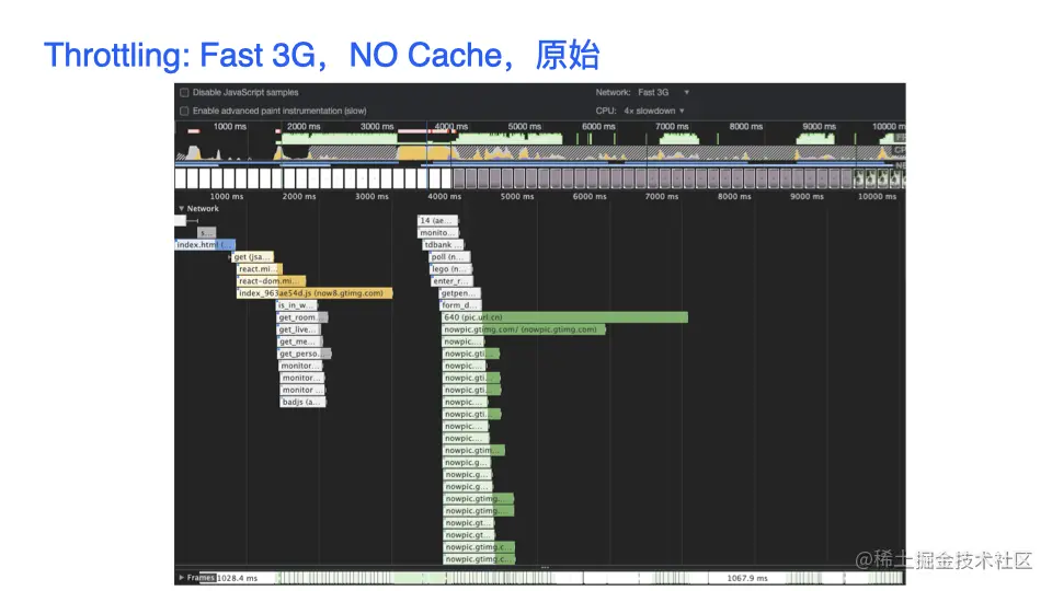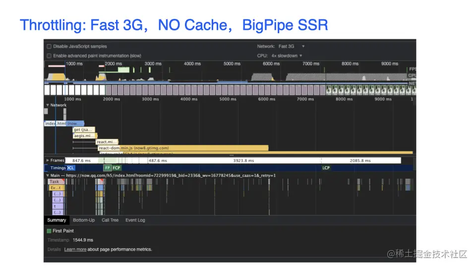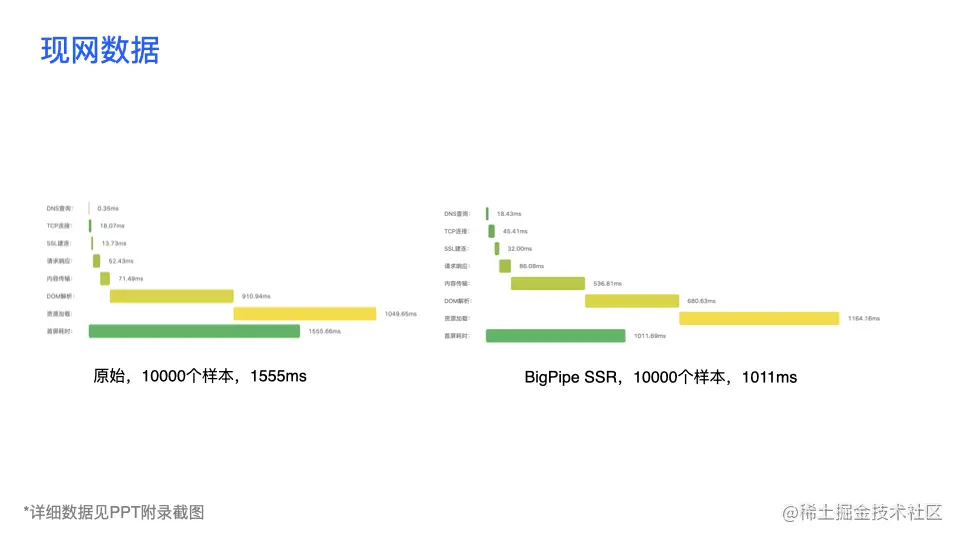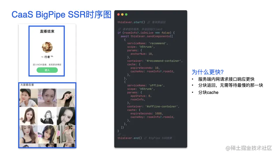 通过这种方式你可以想象是首先他跟非服务端渲染的这种页面相比,它的性能明显是要好的。而对于本身就是服务端渲染的页面来说,由于有了分块渲染能力,也比完整页面渲染的时长要更高效一些。这种特性,特别是在慢速网络里面会更明显。