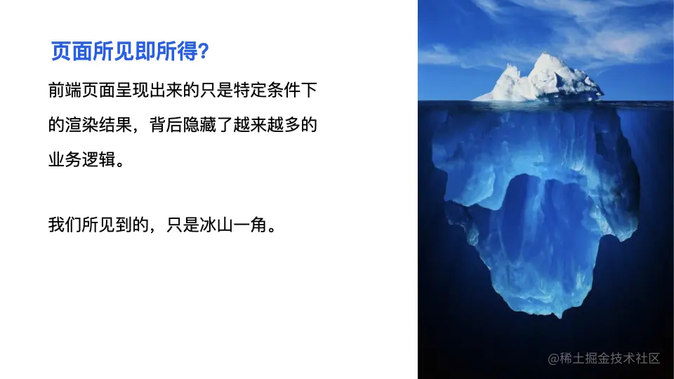 首先我们来思考一下,前端发展了这么多年,今天的前端与过去有什么不同。在我看来,前端页面已经不再是以前那种比较简单的 UI 呈现,而是会包含很多背后的逻辑。这里演化的重要原因是现在的产品设计,也不像以前那么原始,比如说产品经理可能拍个脑袋,他觉得这个页面应该怎么做我们就怎么做。现在的产品设计上会更加的科学,更加的讲究工业化,也就是说会有很多更有逻辑和科学的方式来决定我们的产品最终呈现应该是什么样子。