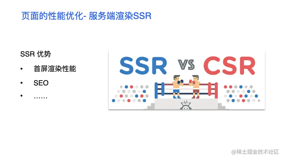 在性能优化领域有一个非常重要的手段,就是通过服务端渲染的方式去提升性能。对于服务端渲染跟客户端渲染这两种方式,服务端渲染它的优势在于第一个是首屏渲染性能会更高,这里面的原因有很多,包括在服务器上去请求后台的数据要比用户从他的浏览器里发出请求,网络链路会更短,那么在获取数据这一块可能就会更快。