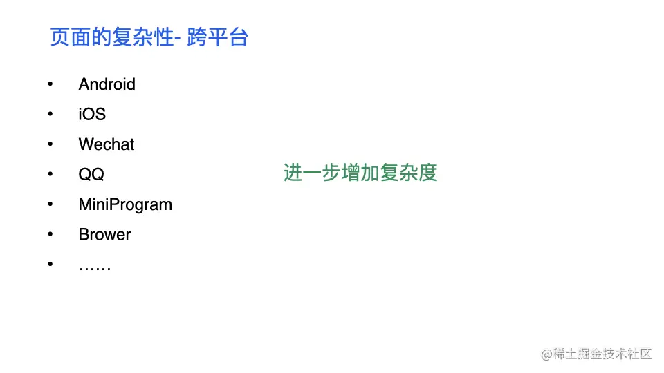 另外一点是在我们的业务里面会存在很多跨平台的场景,比如说我们同样一个页面可能要投放很多不同的平台,常见的例子是在安卓和 iOS 上,它们之间可能会有些微的差异。另外就是像我们如果要投放微信和 QQ,因为它的客户端环境不一样,我们经常会需要调用一些客户端的能力,客户端的宿主环境不一样,那么它的客户端接口就会存在一些差异,这些也是我们需要在代码里兼容的一些地方。所以这种跨平台性也就进一步的增加了我们整个页面的复杂性。结合上面的两种,我们知道今天我们所看到的页面跟它所包含的复杂性是不成正比的,有很多页面的复杂度已经到了非常夸张的程度,与此同时我们在开发这些页面的时候,还需要充分考虑他们的性能。