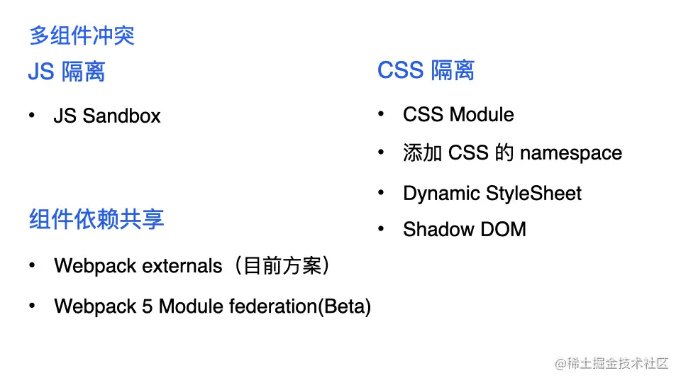 - 包括在实现这种多组件的情况下,需要考虑多组件的冲突问题。像 JS 沙箱的这个方案,CSS 隔离的解决方案,还有组件依赖共享的方案。