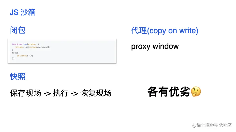 第二类就是快照,即前面讲的单例这种方式,我们可以在全局只有一个沙箱,但是每个组件在使用这些全局能力的时候,你需要在使用结束之后保存现场,这样就清理还原成原始的状态,然后给另一个组件用,另一个组件用完,当你这个组件需要用的时候,再这样还原。这里面会有很多这种切换现场的代码,也是一种方式。还有像代理的方式也是也是可以考虑的。目前我们现在也在探索这一块,其实怎么样做更好,这一块还没有一个最终完全确定的方式,各有各的优点。
