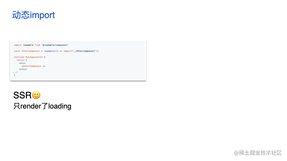 看这个官方代码片段。在这个代码片段里面,我们在服务端部署中,它真正渲染的其实只是 loading 式的服务端渲染,而对于组件本身其实还是需要通过客户端去执行一下,所以并不彻底。