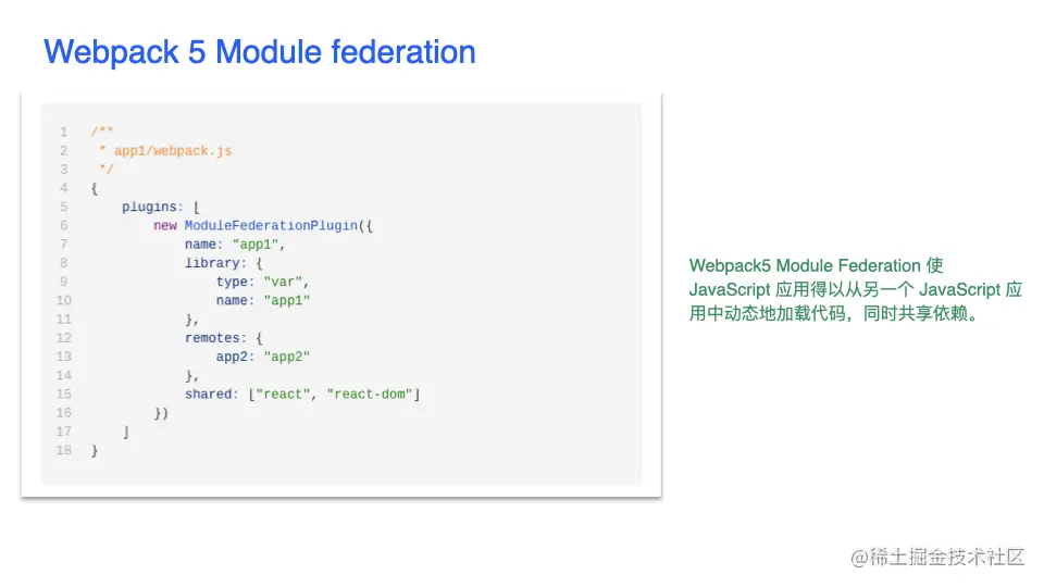 来看我这个模块联邦的一个示例的代码,其实就是在你的构建里面去加一个插件,这个插件里面就说明你需要依赖的另外一个应用和它的一些库的情况。比如说这里设置你需要使用的是另外一个应用里面的 React 基础包,那么它自己打包的时候是不会把它打出去的,而在运行的时候,它可以从另外一个应用里面读进来,也就是说通过 Webpack 模块联邦这样一个功能,我们可以让应用从另一个应用里面去加代码,这种方式其实就可以很优雅的去解决我们组件之间这种依赖共享的这样的一个问题。