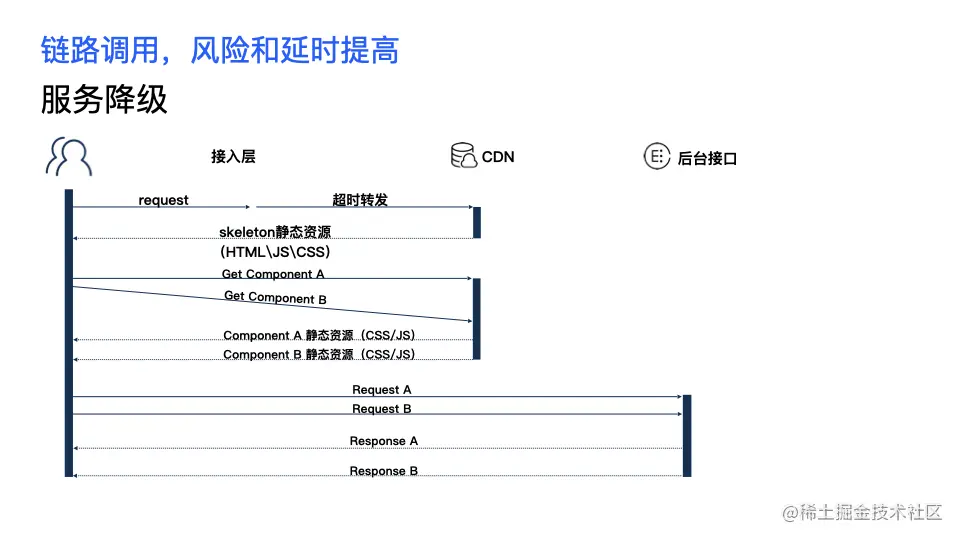 另外一点就是我们需要考虑服务降级的情况,因为服务本身有可能有稳定性的问题,比如说流量突然增加或者是服务异常等等,那么我们也是有这样的方式的,当我们发现整个请求超时或者说失败的话,我们会将其转发到常规的 CDN 的这样一个路径上,就是正常的 HTML、JS、CSS 这样一个请求的方式,然后由客户端去渲染。这种方式它虽然效率会低一些会慢一些,但是它能够保证整个页面的正常打开,所以这会有一个服务降级的方案去规避异常的情况。