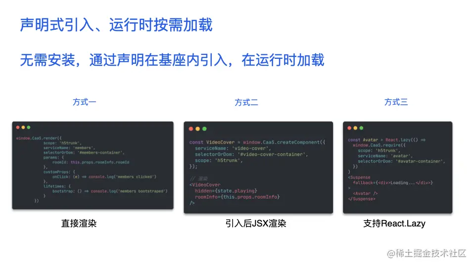 这里面可以看到,每一个组件服务都是有自己特定的名称,相当于是一个名字服务,可以通过这个名称去寻址,找到它所对应的 Serverless 的函数,然后拿到结果之后直接渲染出来;第二种方式也可以这样进行,通过 JSX 的方式直接插入到我们原本的页面中,利用 CSR 方式去渲染;第三个懒加载,像 React 本身就有 React.lazy 这样一个懒加载能力,我们可以将我们这些组件服务拉回来的结果,也就是渲染的结果,以懒加载的方式去渲染到页面上,它会在组件没有拉回来的时候,展示一个 loading 的状态,在拉回来之后会把组件的渲染结果展示出来。通过这种方式,我们解决的是一部分组件在运行时加载的一个能力:第一时间将骨架屏的静态的时间表先展示,然后再通过主 JS 向我们的组件服务去发起请求,去拉取组件的渲染结果。