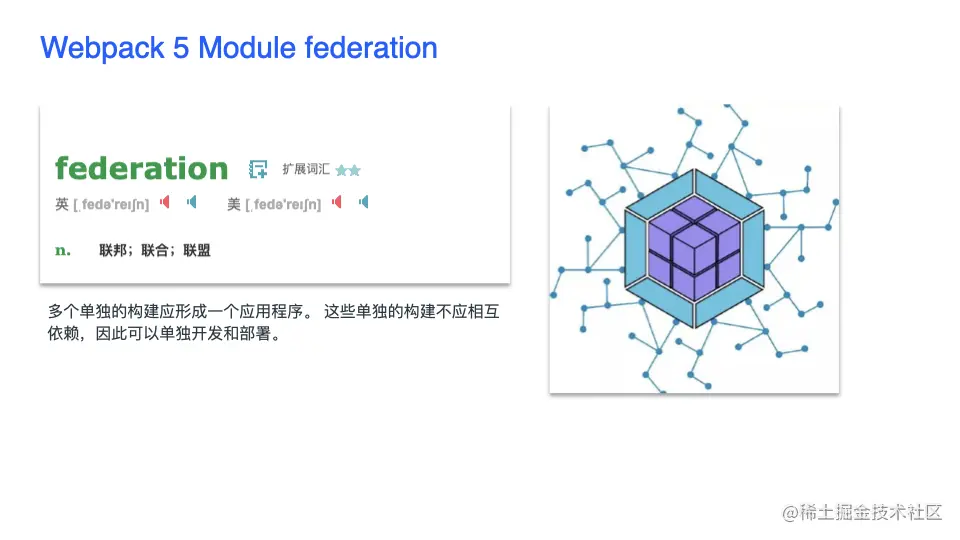 幸运的是前几天 Webpack5 正式发布了,里面有一个非常有意思的特性,叫 Module Federation。它的作用是你可以依赖另一个应用的组件或者说依赖,使用它的好处就是让你两个应用在开发的时候都不需要考虑依赖的问题。在运行的时候,它通过一种特殊的模式可以去动态的加载其他应用里面的一些基础模块。