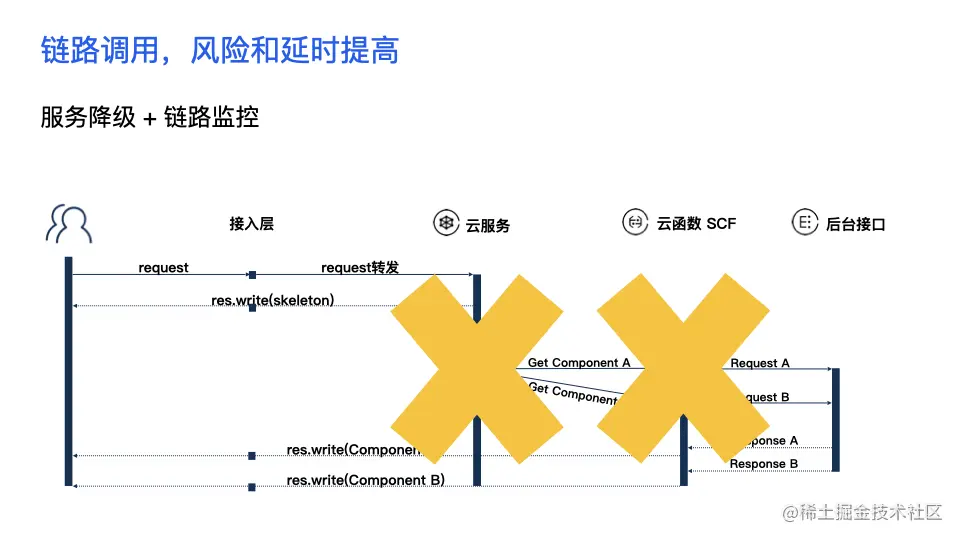 当然通过这种方式之后,我们的整个请求和链路会变得更长更复杂。比如我们中间会有很多环节,要考虑到整个服务的稳定性的话,需要对每一个链路进行监控。我们可以利用云函数本身的监控,这就看你所选择的云厂商的一个能力了。但是根据实际的业务情况,我们也可以考虑把云服务和云函数这一块进行整合,也就是你的服务端渲染服务进行整合。