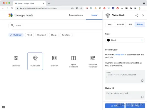 找到合适的图标后,新的 Flutter 标签会显示如何使用它,或者可以选择仅下载该图标以用作应用程序中。