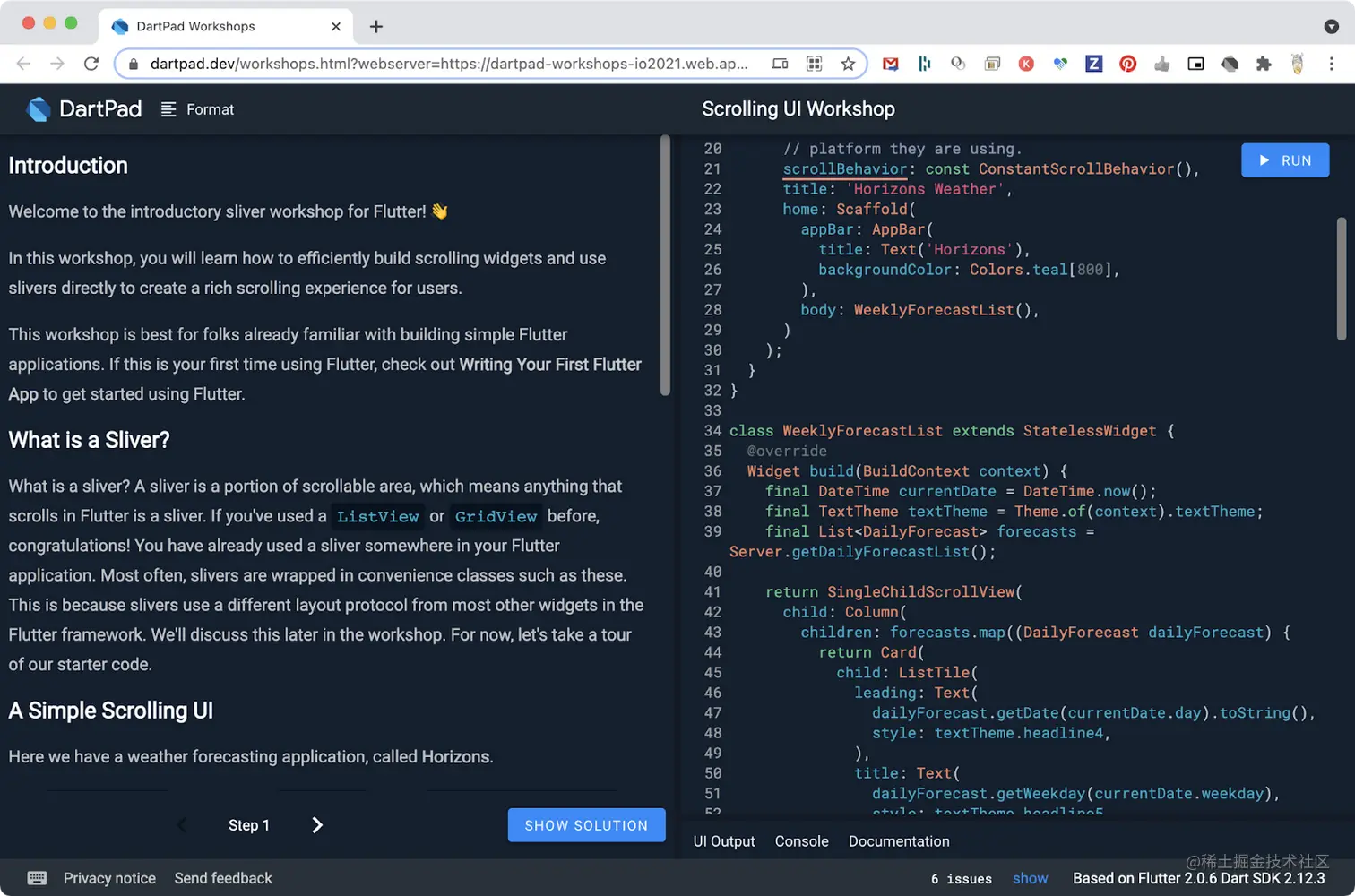 通过直接向 DartPad 添加说明,我们可以为 I/O 提供指导性的工作室体验,但是我们不只是为自己的工作室构建它;如果你想在 Dart 或 Flutter Workshop 中使用它,可以按照 DartPad Workshop 创作指南进行操作。