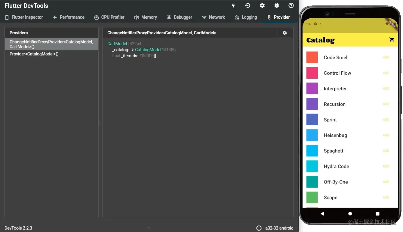 事实上,这个标签是由 Remi Roussel 创建,provider 包维护人员。如果你正在运行最新版本的Flutter DevTools,并且正在调试使用 provider 插件的 Flutter 应用程序,则将自动获得新的“Provider” 选项卡。