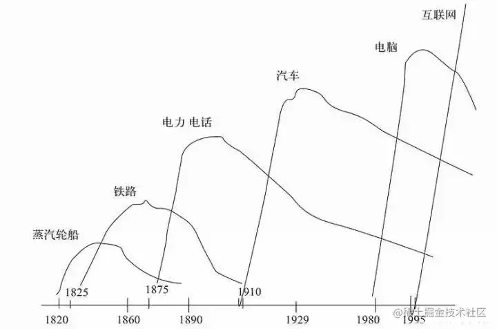 上图,是美国200年来行业增速变迁图,描述了从1820年的蒸汽轮船到1995年的互联网在内的,几大行业的变化趋势。