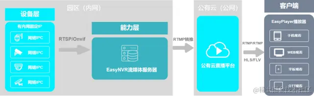 个别场景中有全网直播需求,访问量会比较大,此时可以选择接入云视频转发平台,如阿里云、腾讯云等主流的云直播平台,将并发的压力释放给云平台,实现全网在线看视频,保证视频的流畅与稳定。
