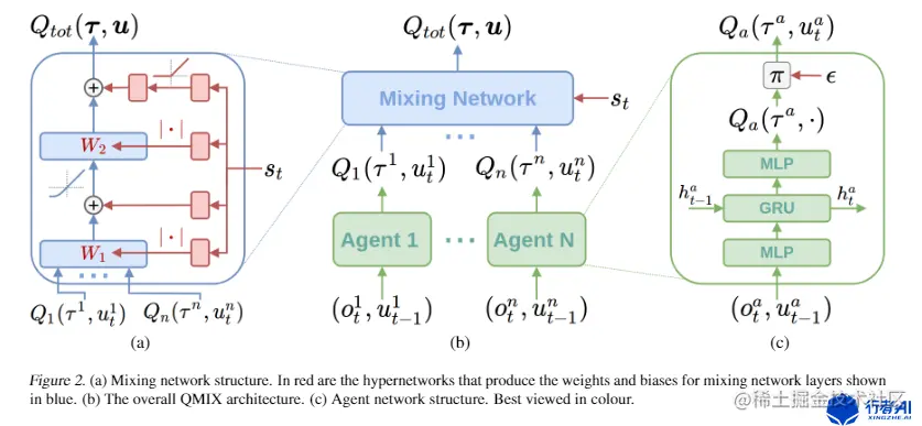 QMIX的模型由两大部分组成(三个网络组成),一个是agent network,输出单智能体的的函数,mixing network则是以作为输入,输出为联合。为了保证单调性,mixing network的网络参数权重和偏置通过hypernetworks网络计算得出,并且hypernetworks输出的网络权重都必须大于0,对偏置没有要求。