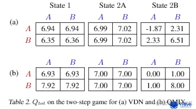 在paper中还提到了QMIX要比VDN更好的使联合动作的优势更加突出,下图中,a表示VDN,b表示QMIX,agent1和agent2在学习之后,VDN中A和B的联合最优动作的价值为6.51,而QMIX的联合最优动作的价值为8.0。可以看出QMIX体现出的优势联合动作的价值更大。