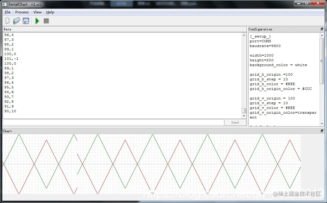 这个是国外的一个串口波形显示软件,可以通过配置文件配置显示多个通道的波形。没有通道个数的限制。还可以自定义波形的最大值,最小值,显示颜色。唯一不足的是波形不能缩放,只能看到当前数据的实时波形。