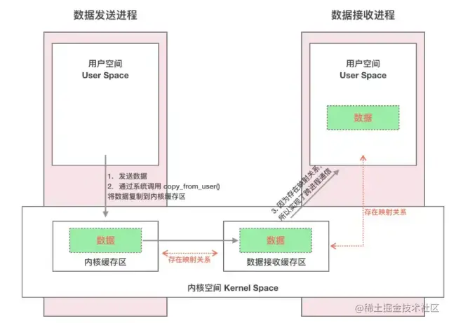 发送方进程通过系统调用 copyfromuser() 将数据 copy 到内核中的内核缓存区,由于内核缓存区和接收进程的用户空间存在内存映射,因此也就相当于把数据发送到了接收进程的用户空间,这样便完成了一次进程间的通信。