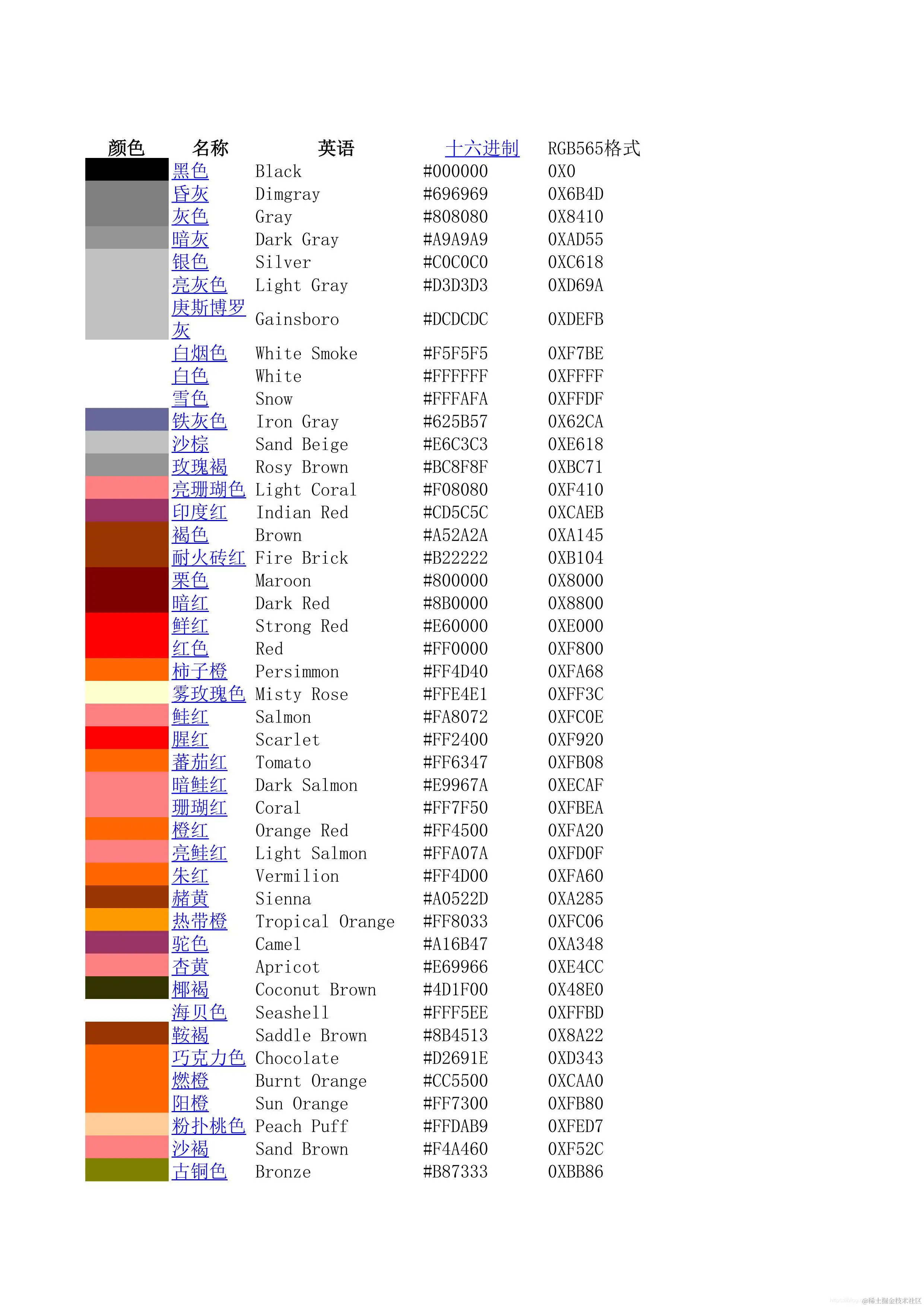 | 颜色 | 名称 | 英语 | 十六进制 | R | G | B | 16R | 16G | 16B | 16rgb(rgb565) | RGB565格式 | |