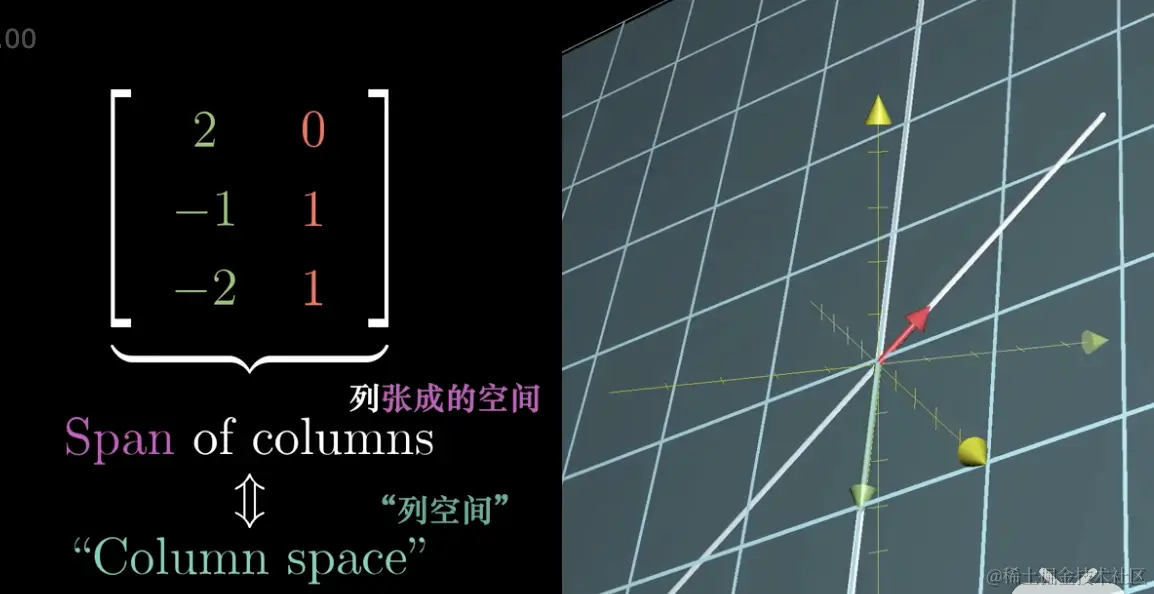 我们知道矩阵的列代表矩阵的基向量变换后到达的位置,变换后的基向量张成的空间就是列空间,换句话说,列空间就是矩阵的列所张成的空间。